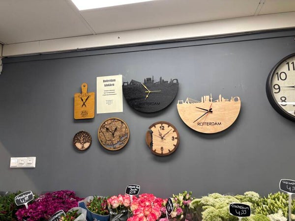 Halfronde klok met skyline van Rotterdam en Quartz uurwerk (1xAA batterij excl.) maten ca 43 cm breed 28 cm hoog