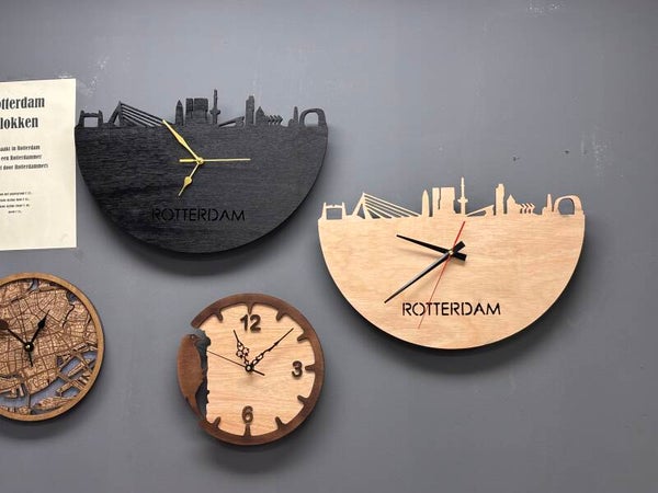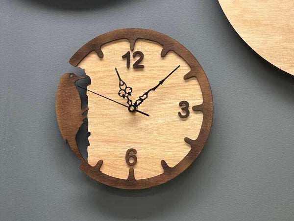 laser gesneden klok in 2 lagen met de afbeelding van een specht.