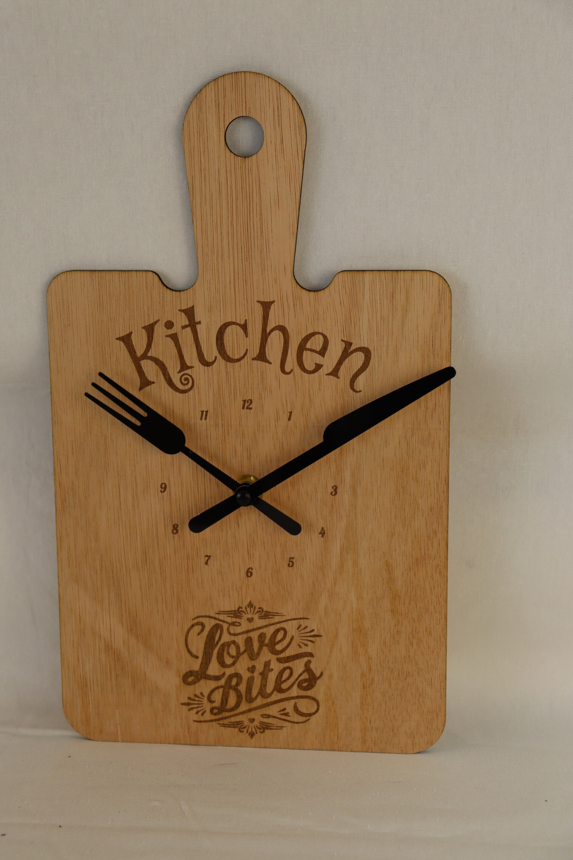 Deze charmante broodplank heeft een uniek ontwerp met wijzers van een mes en een vork, perfect om je keuken een speelse touch te geven. Het quartz uurwerk zorgt voor een nauwkeurige tijdweergave, en de ophanghaak maakt het ophangen een fluitje van een cent. Met een afmeting van ongeveer 17 cm breed en 29 cm hoog past hij in elke keuken. Gemaakt van duurzaam FSC eucalyptushout van 3 mm dikte, combineert deze broodplank functionaliteit met milieuvriendelijkheid.