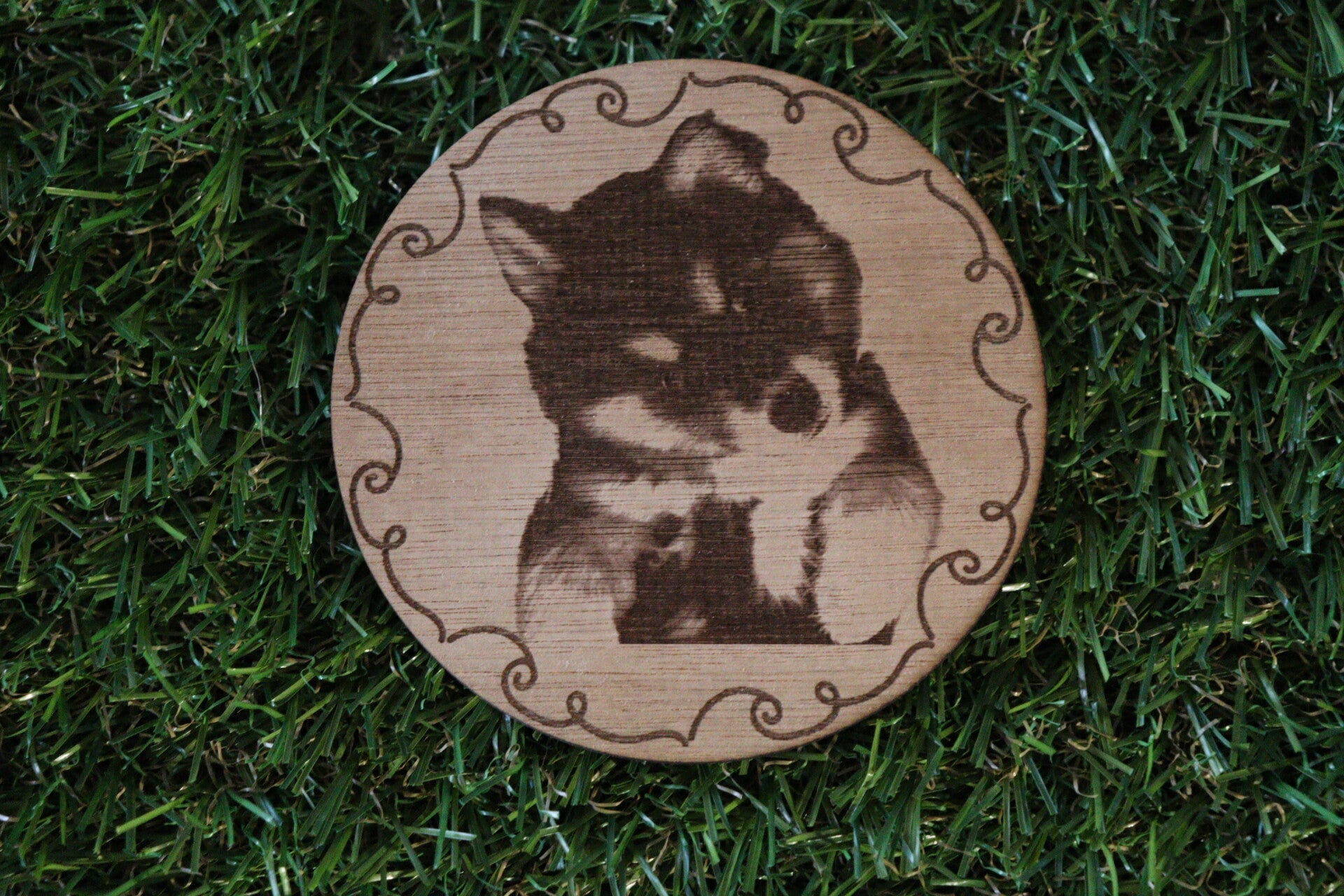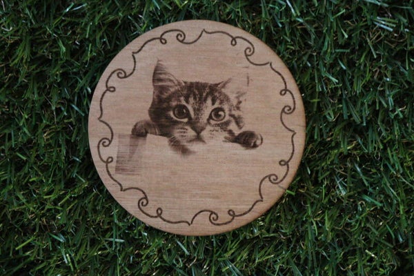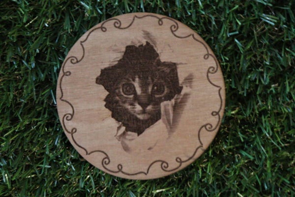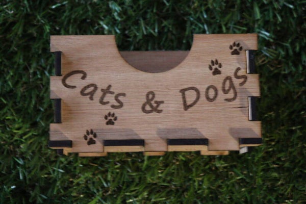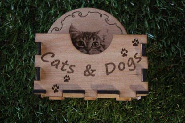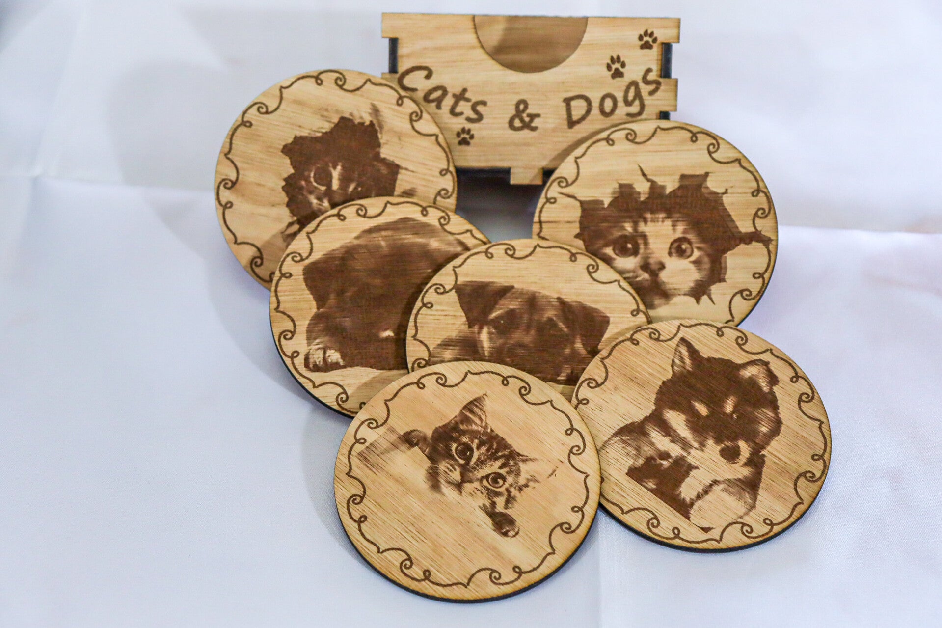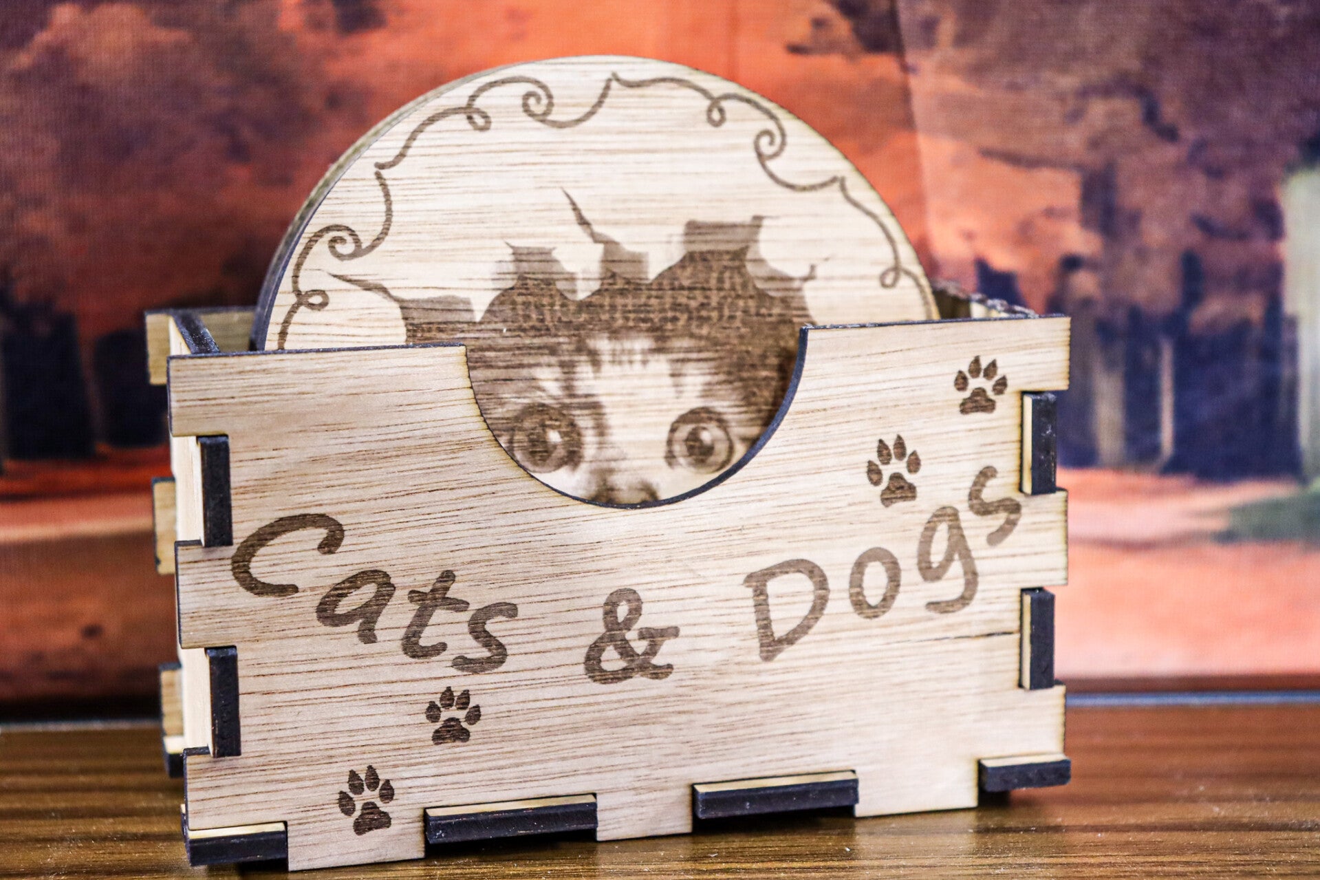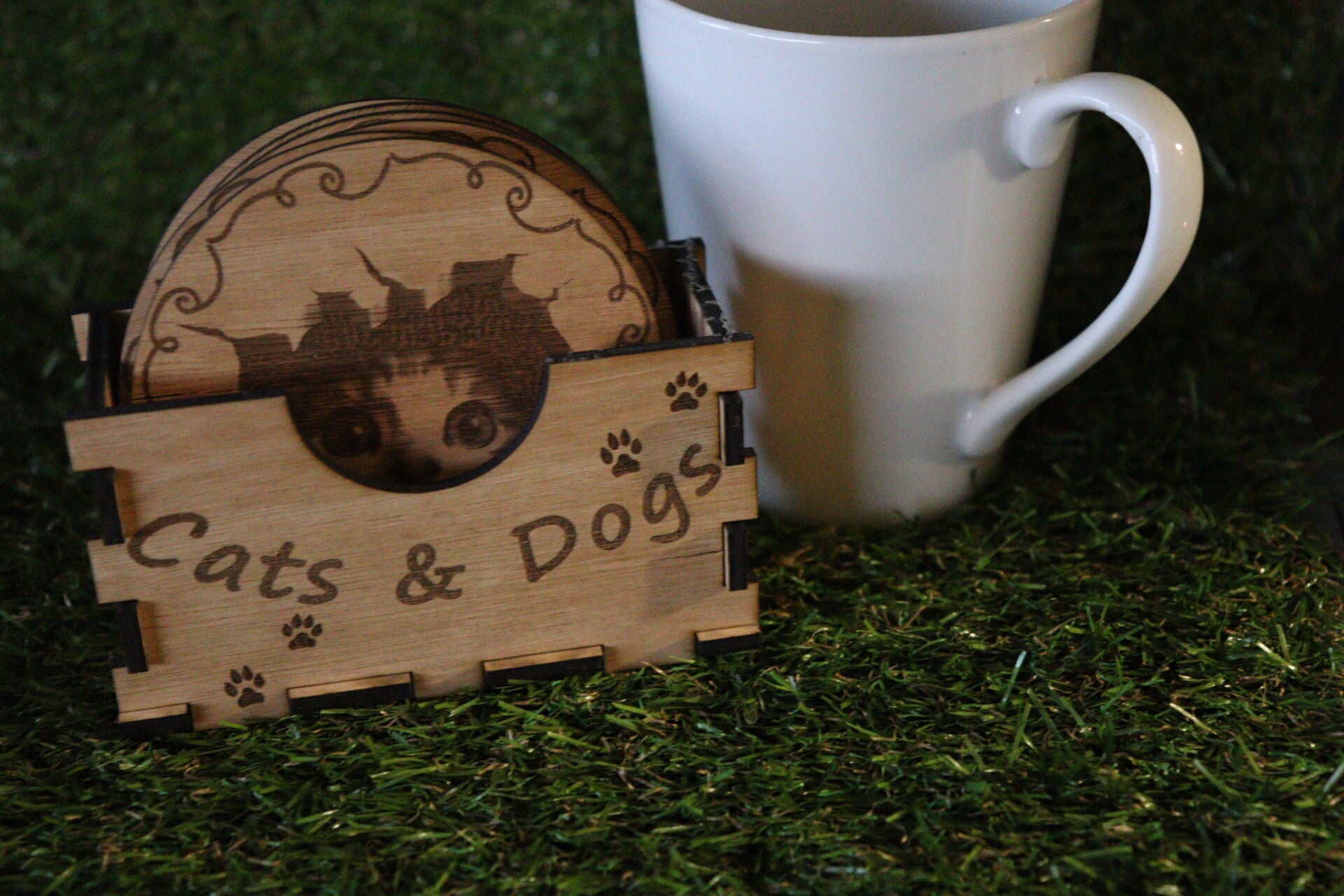 6 houten onderzetters in een leuke houten houder met afbeeldingen van honden en katten doorsnede ca 9cm