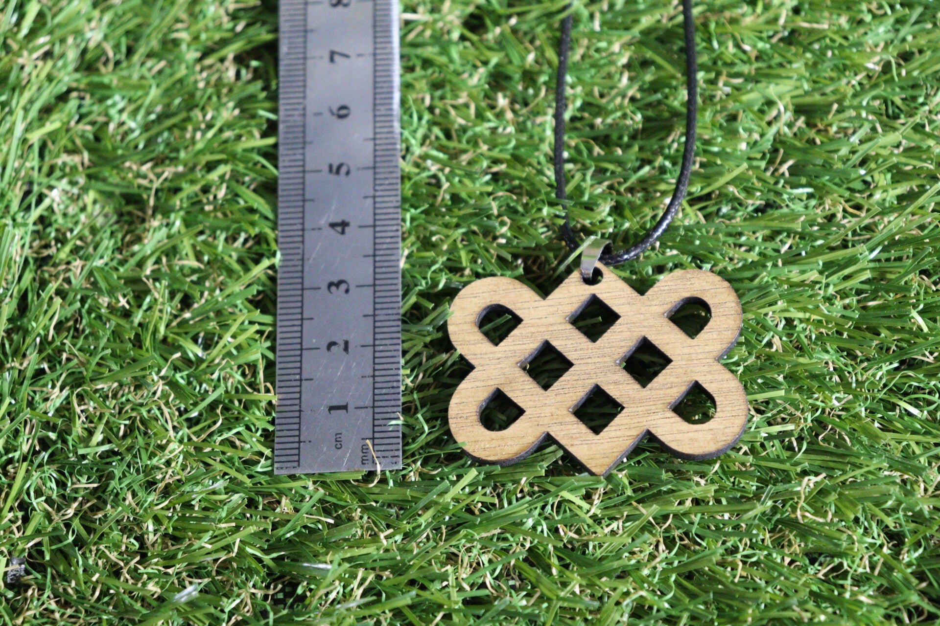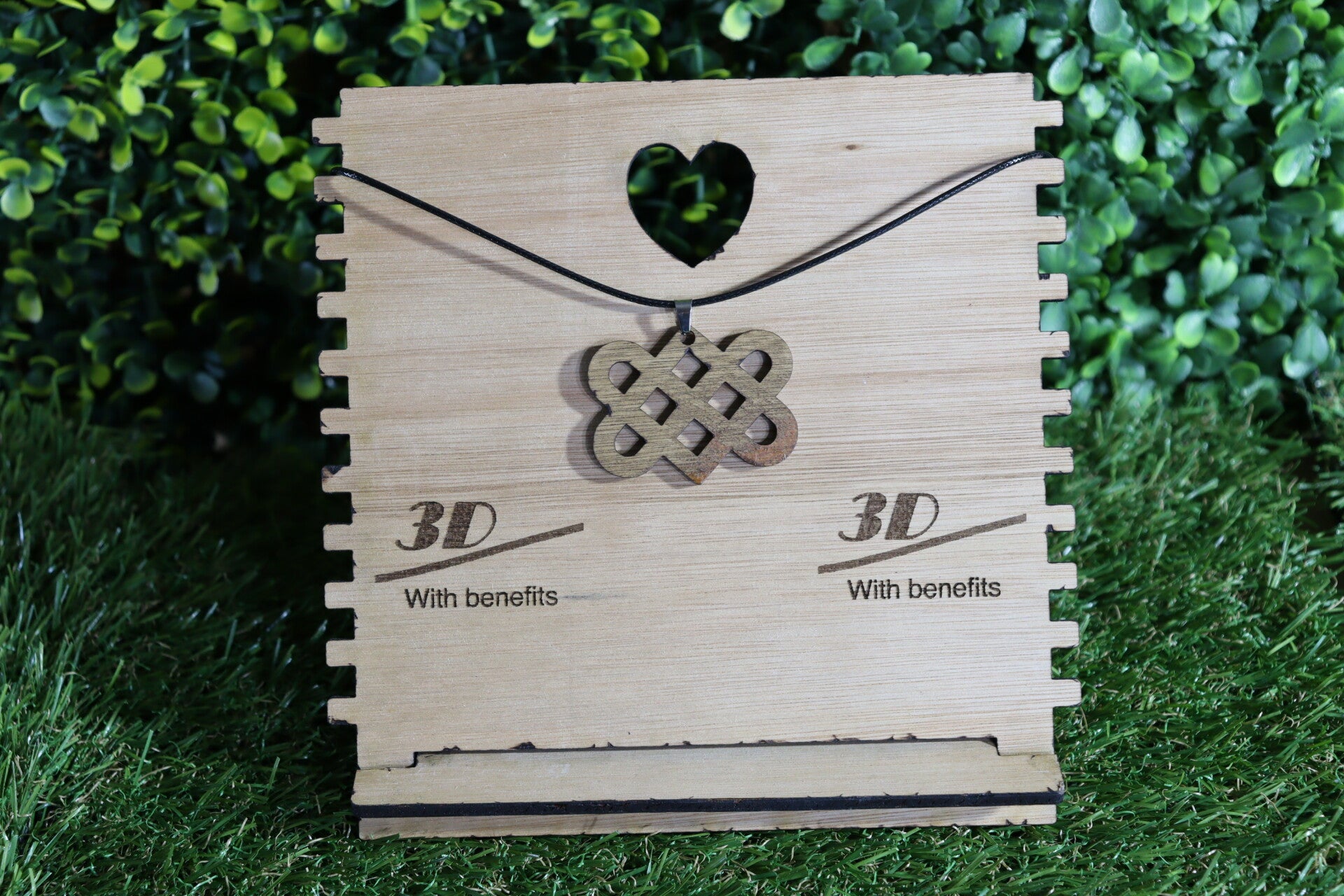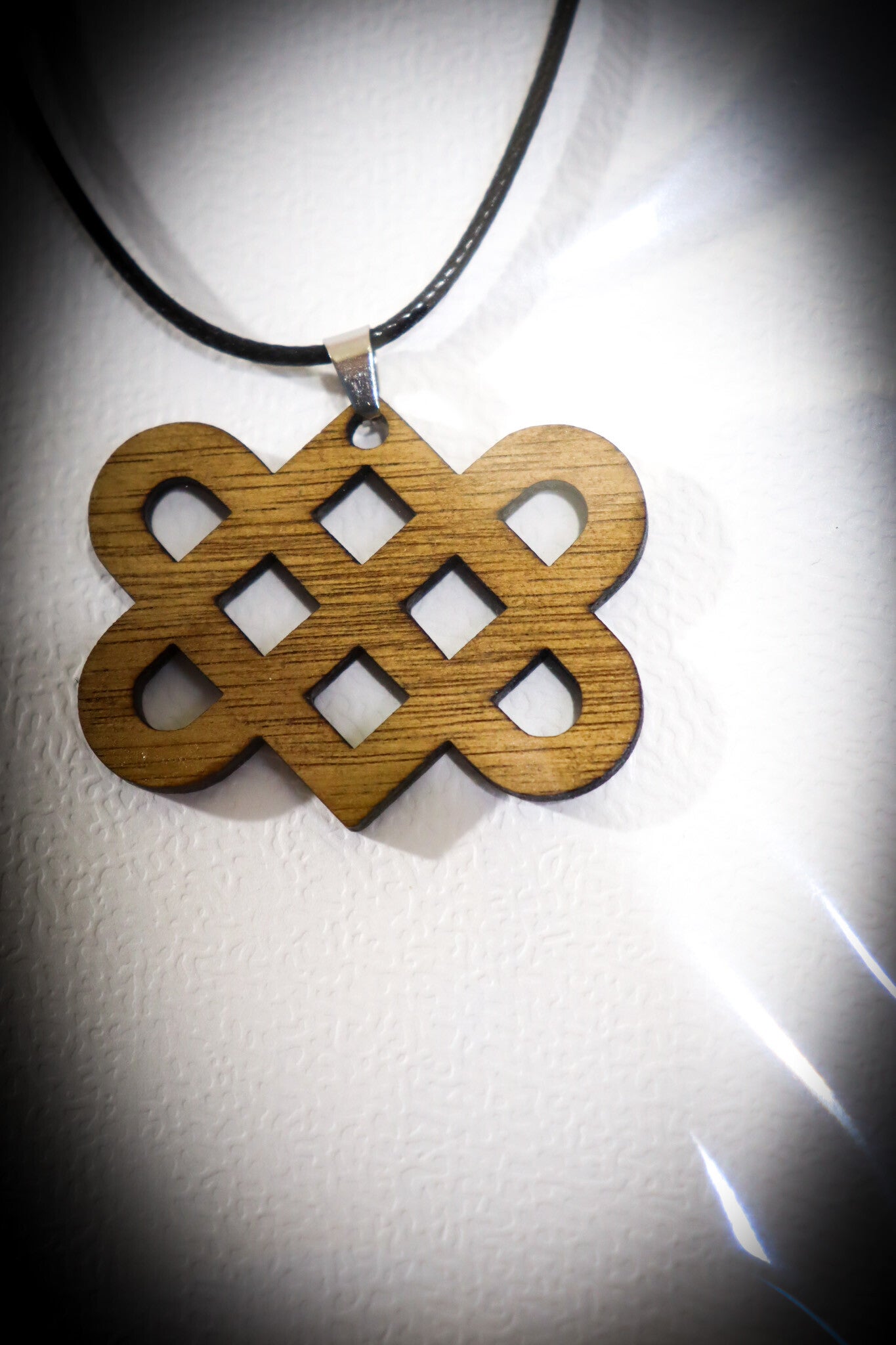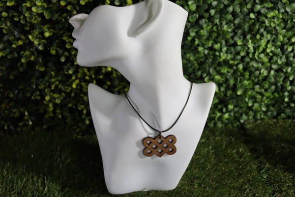 Halsketting met lasergesneden houten hanger. De keltische liefdesknoop staat voor een verbinding zonder begin en/of einde.