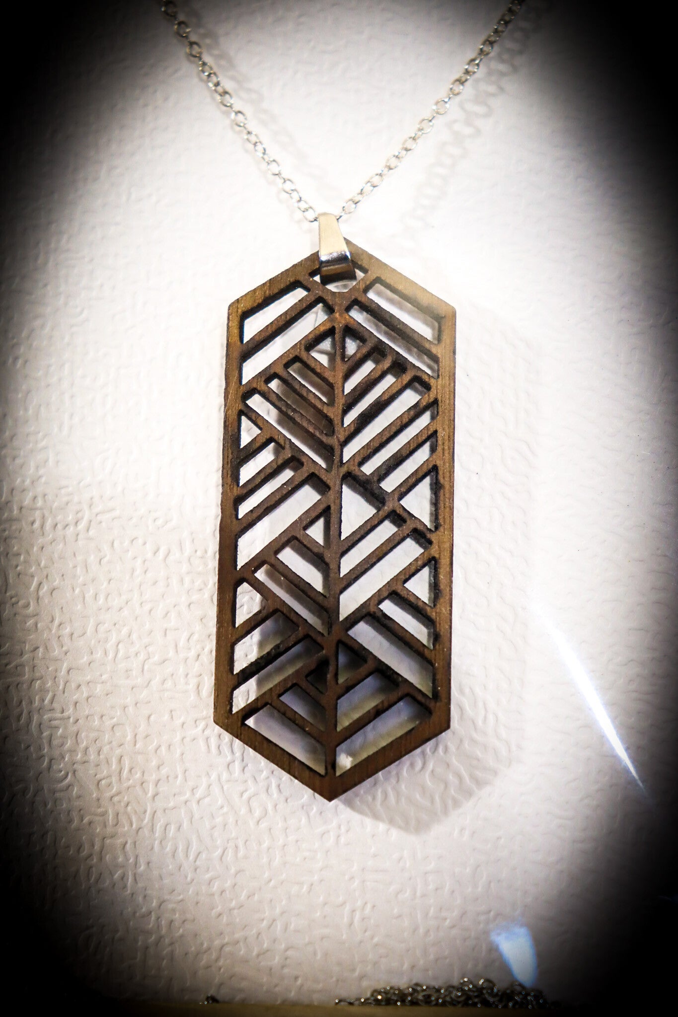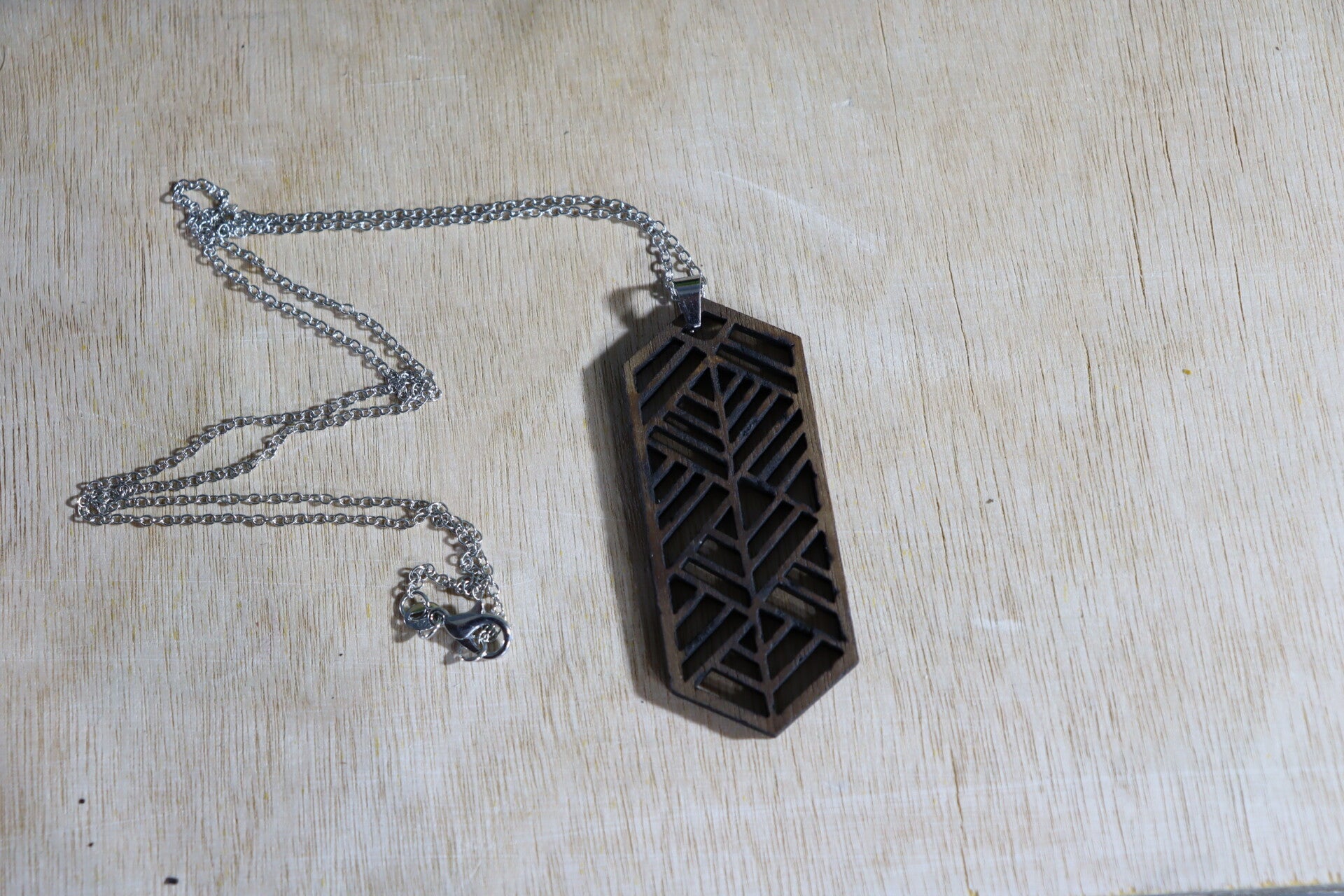 Verzilverde halsketting met lasergesneden houten hanger.