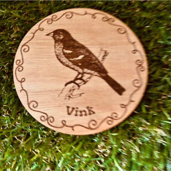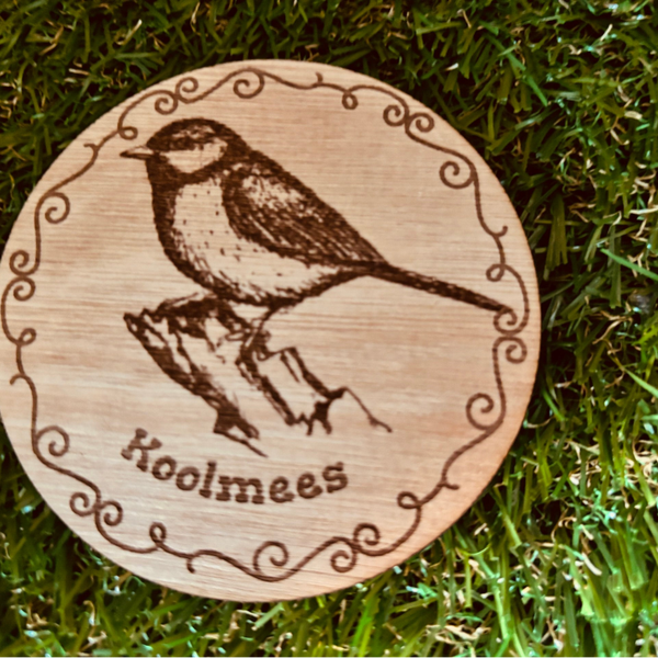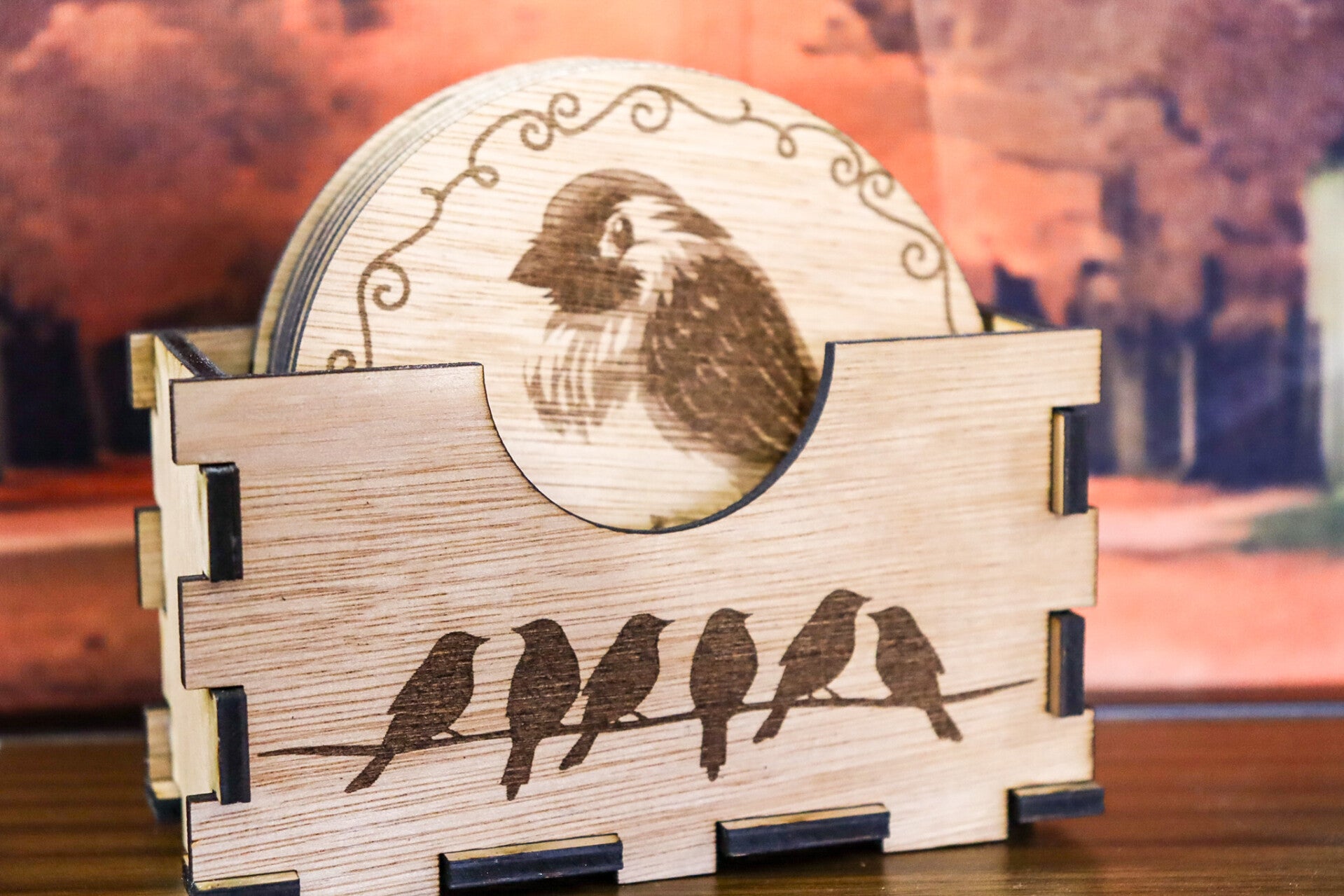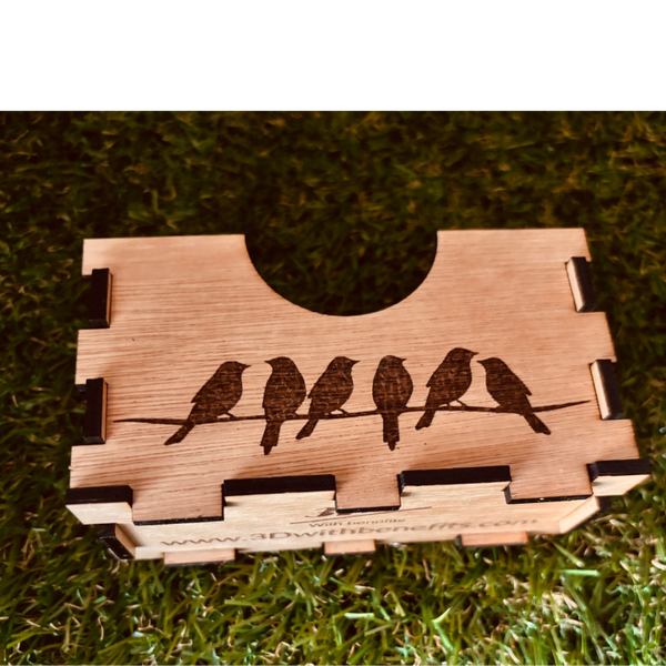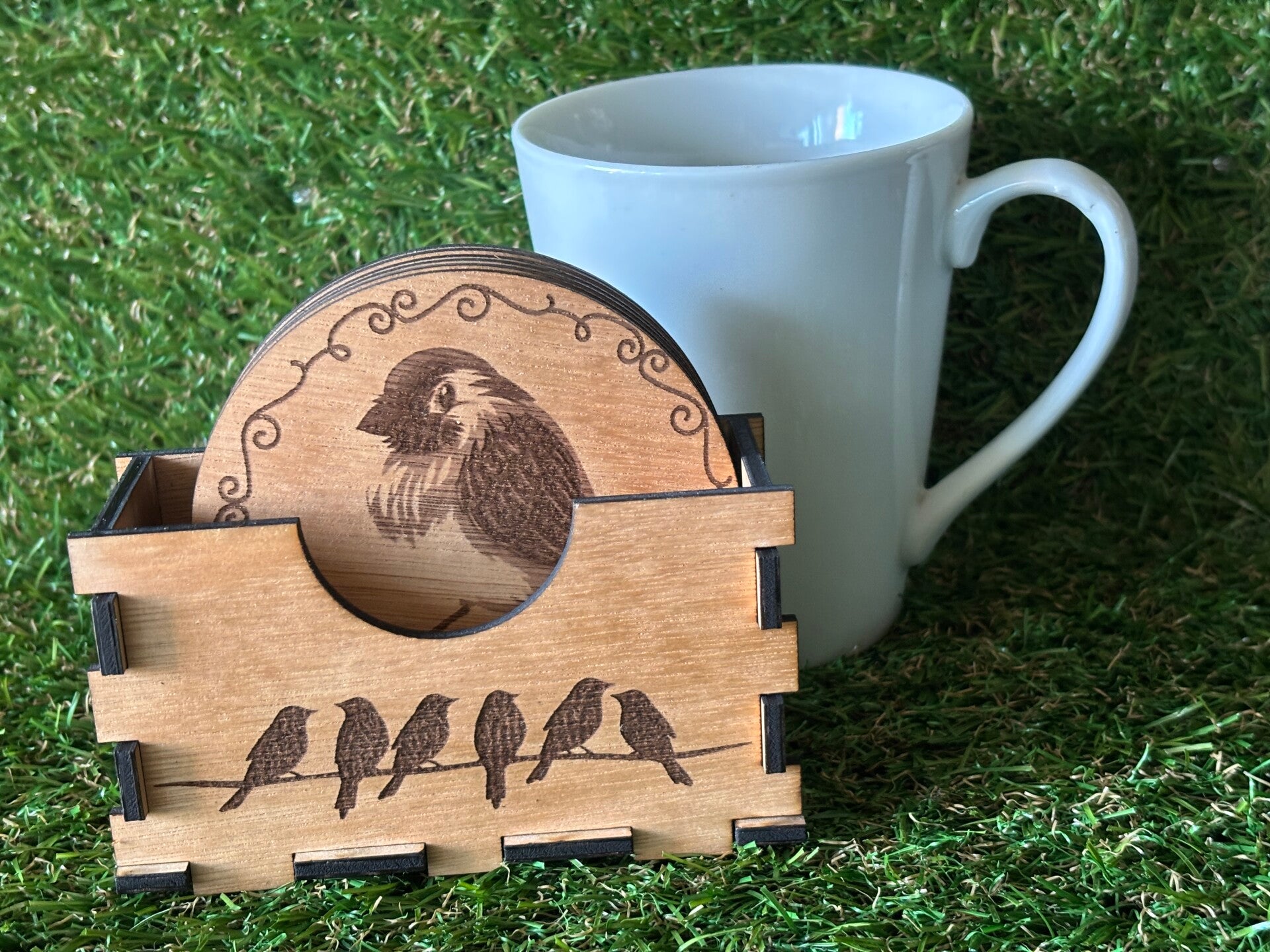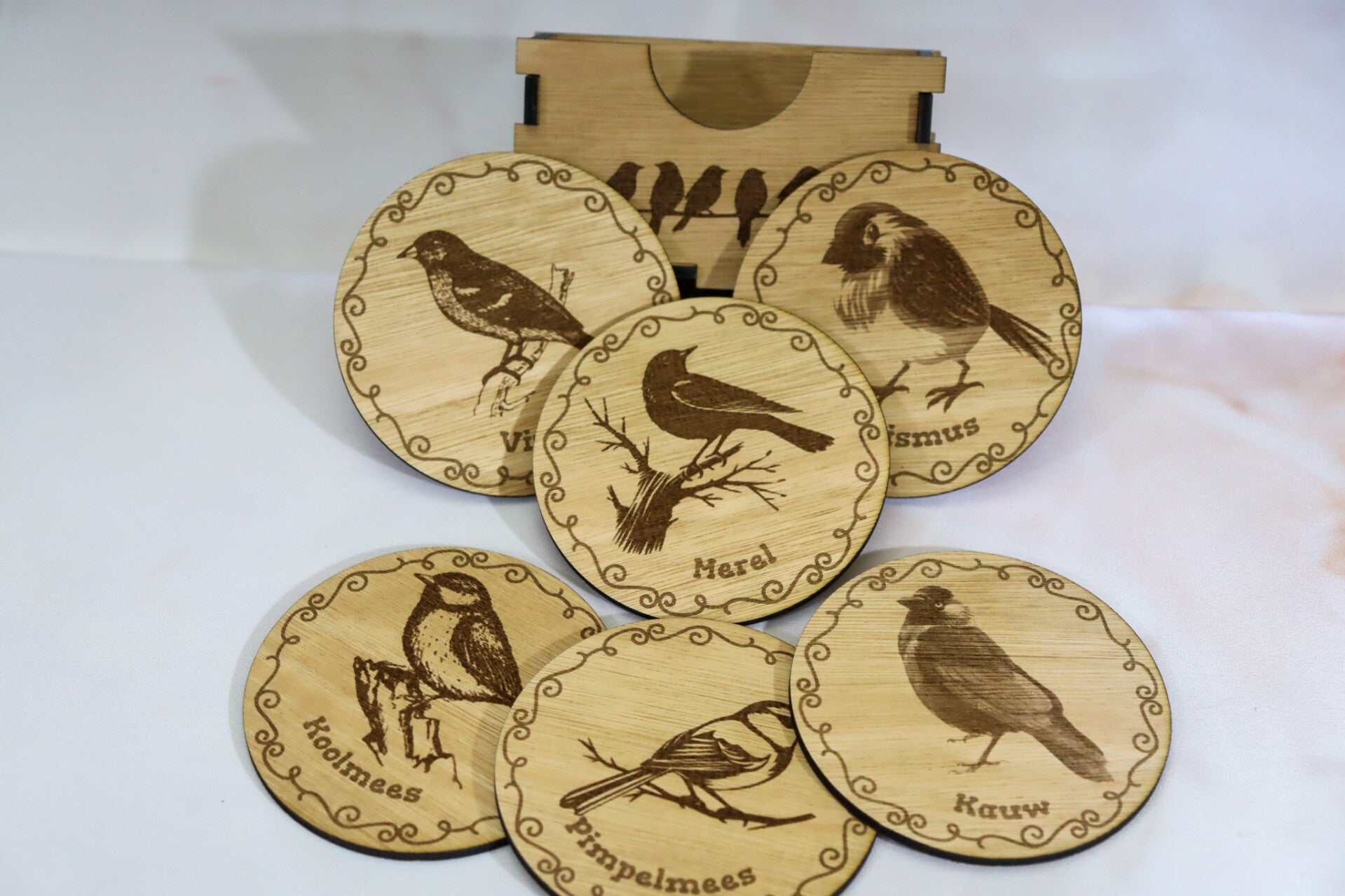 Set onderzetters van de 6 meest voorkomende tuinvogels in een leuk houten doosje. Alles netjes gelakt en lasergesneden.