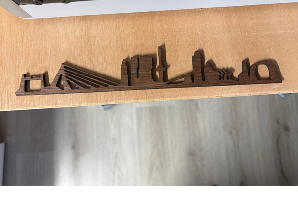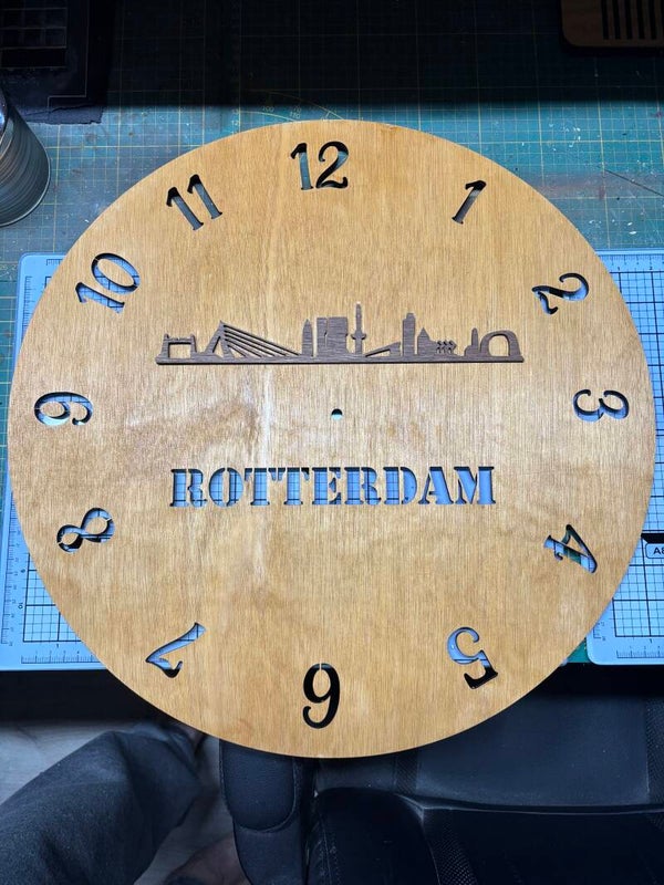 Wandklok 50 cm doorsnede met de skyline van Rotterdam. De cijfers en letters zijn er met de laser uitgesneden.