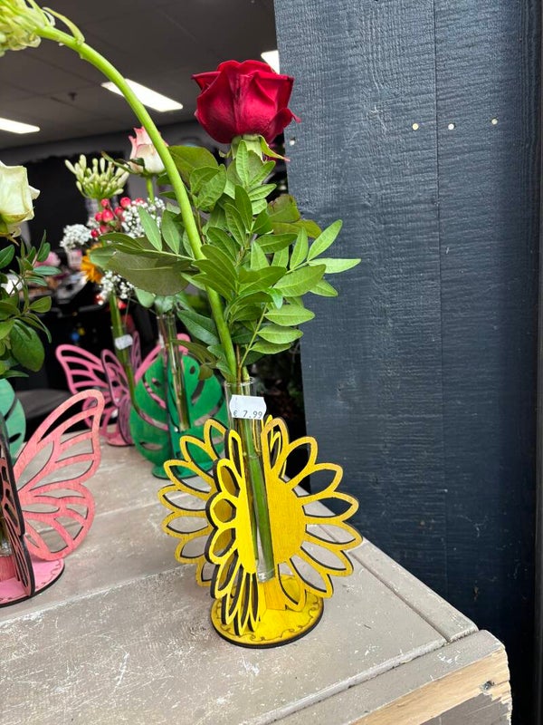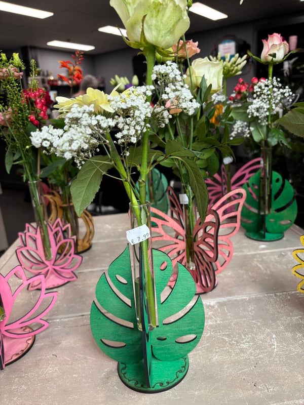 diverse mini vaasjes. Met de laser gesneden vaasjes voorzien van reageerbuisje (glas) 15cm x 2cm.