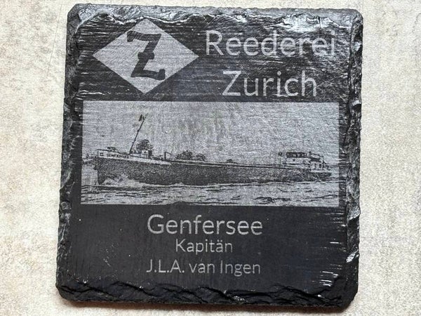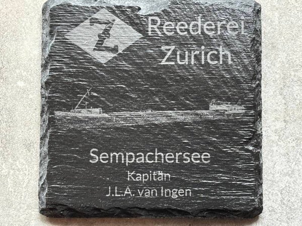 Leisteen onderzetter donkergrijs met eigen afbeelding/tekst 10x10 cm cq. 10 cm diameter. Aan de onderzijde voorzien van rubber voetjes.