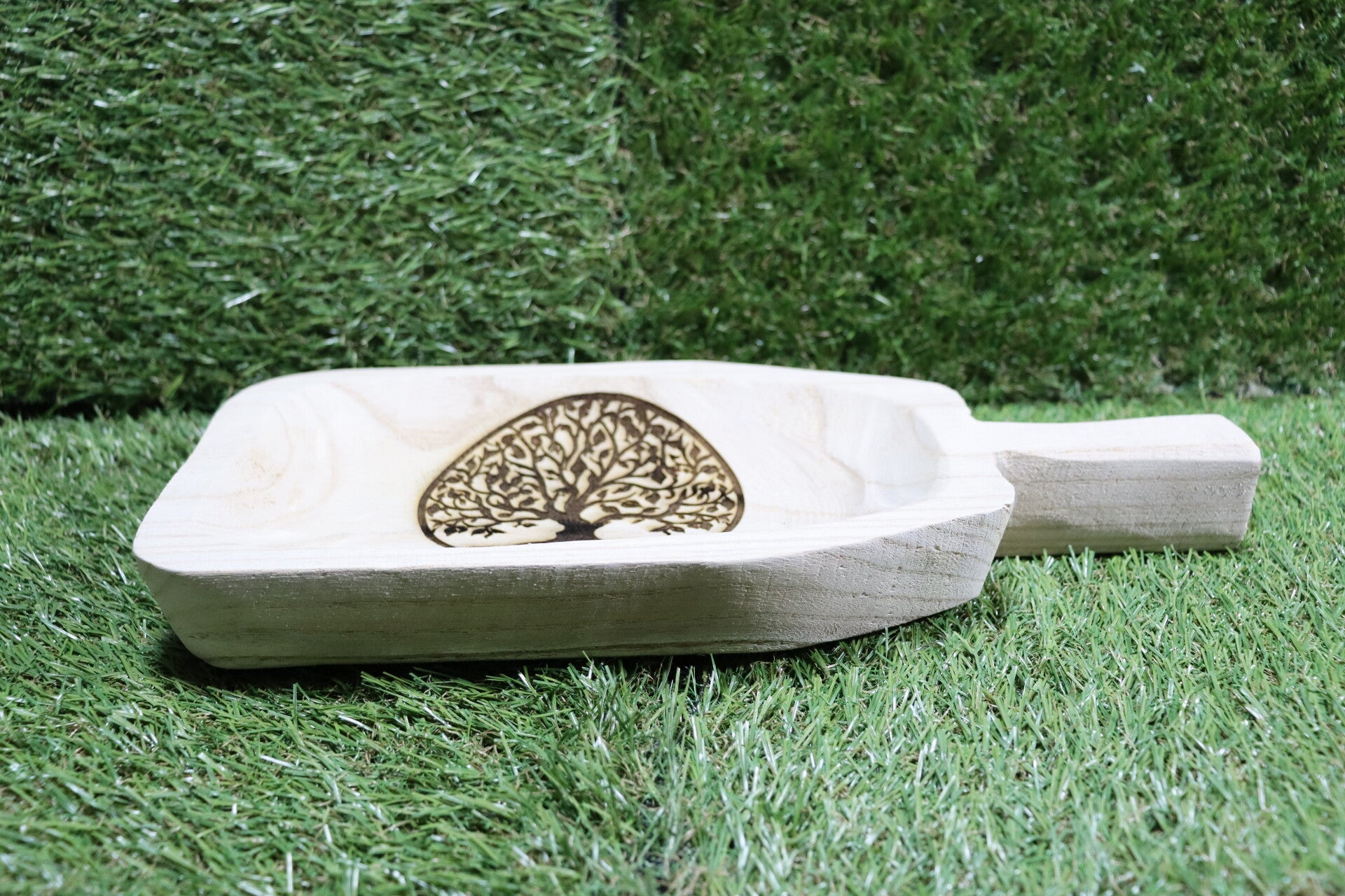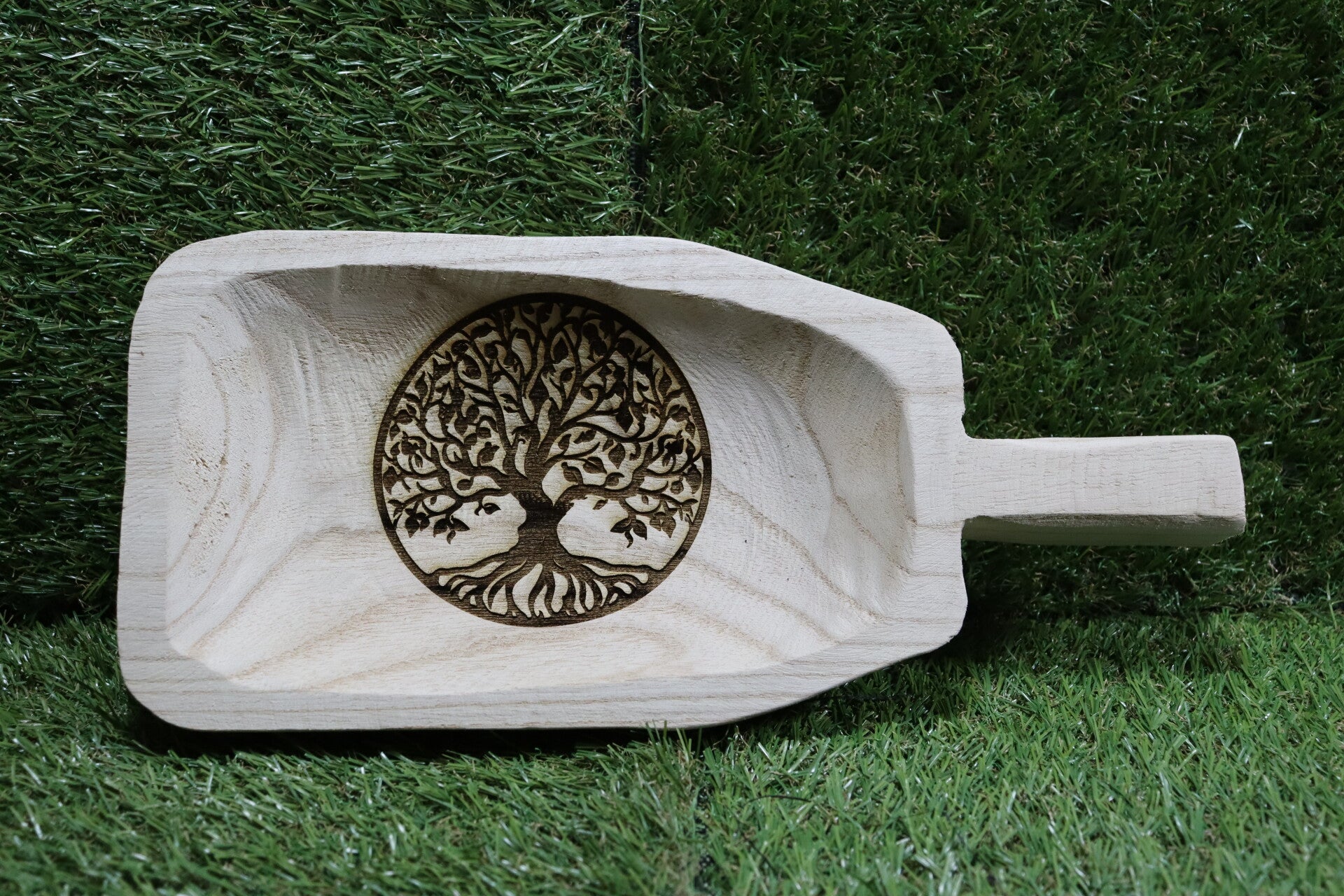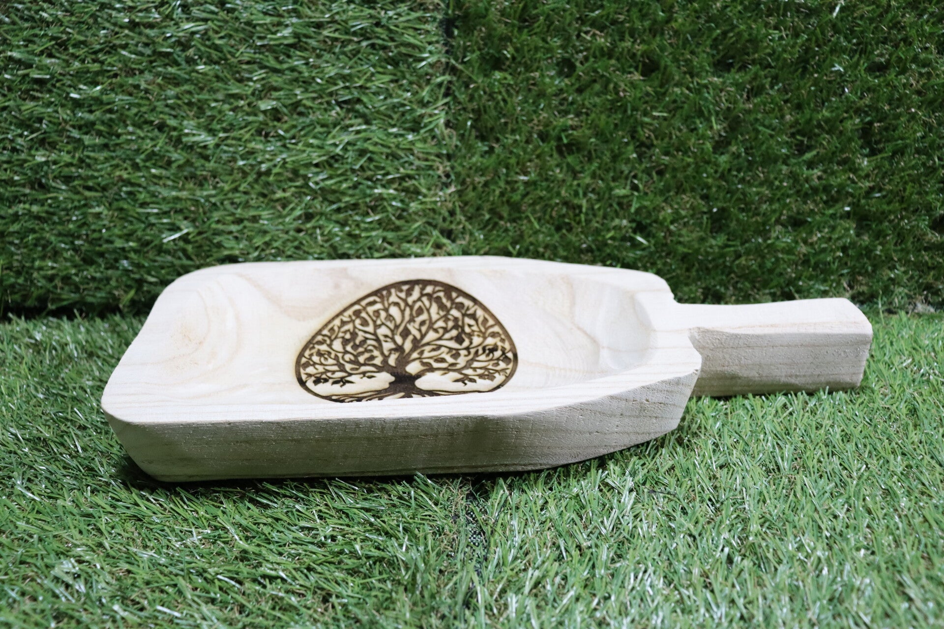 Blank houten schaal met in dit geval een afbeelding van de "tree of life".