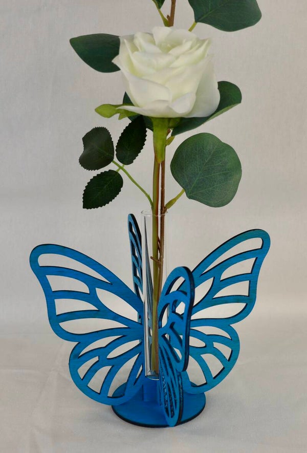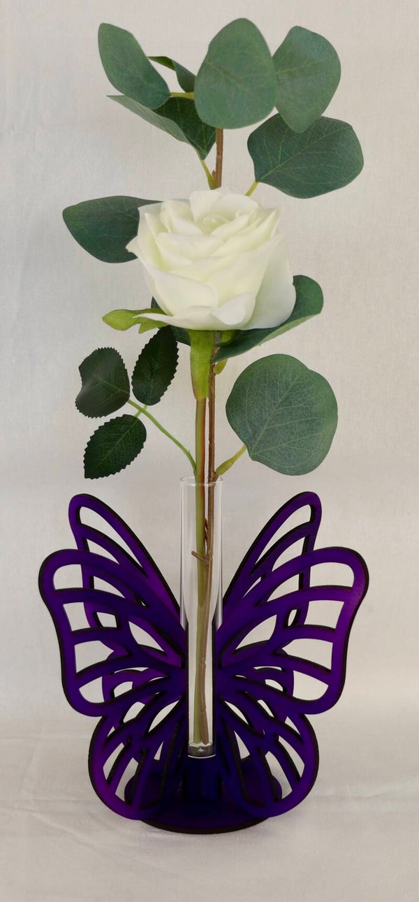 Laser gesneden vaasje met reageerbuis en zijde roos. U kunt kiezen uit de kleuren roze, paars of blauw.