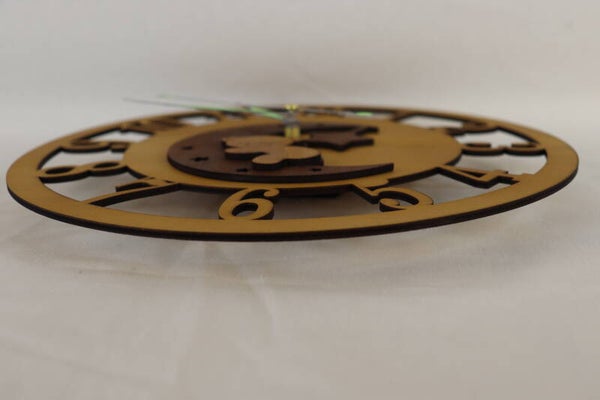 Schattige klok voor op de kinderkamer met een slapend beertje op de maan. Gemaakt met 3 lasergesneden lagen hout.